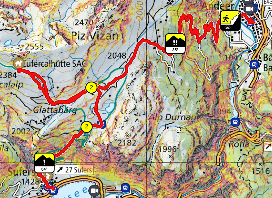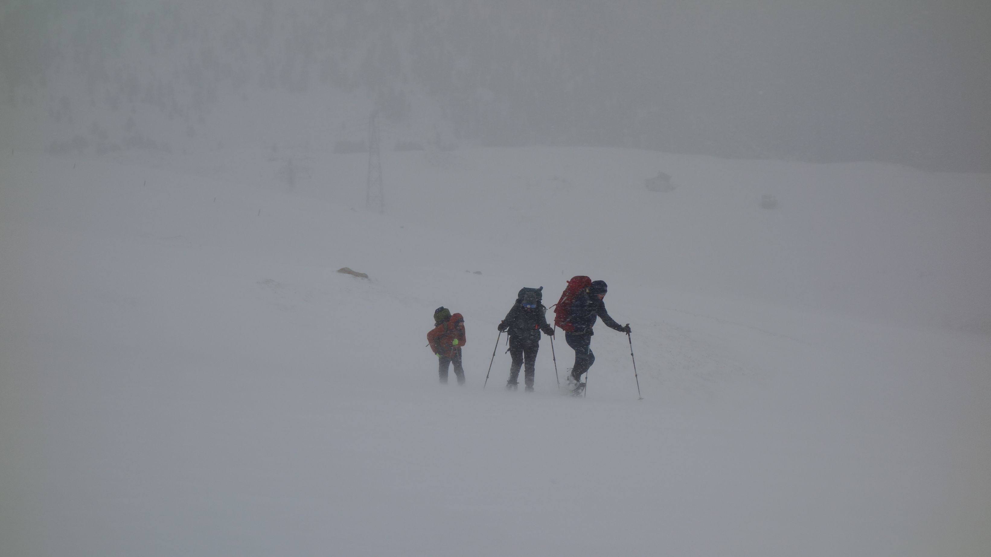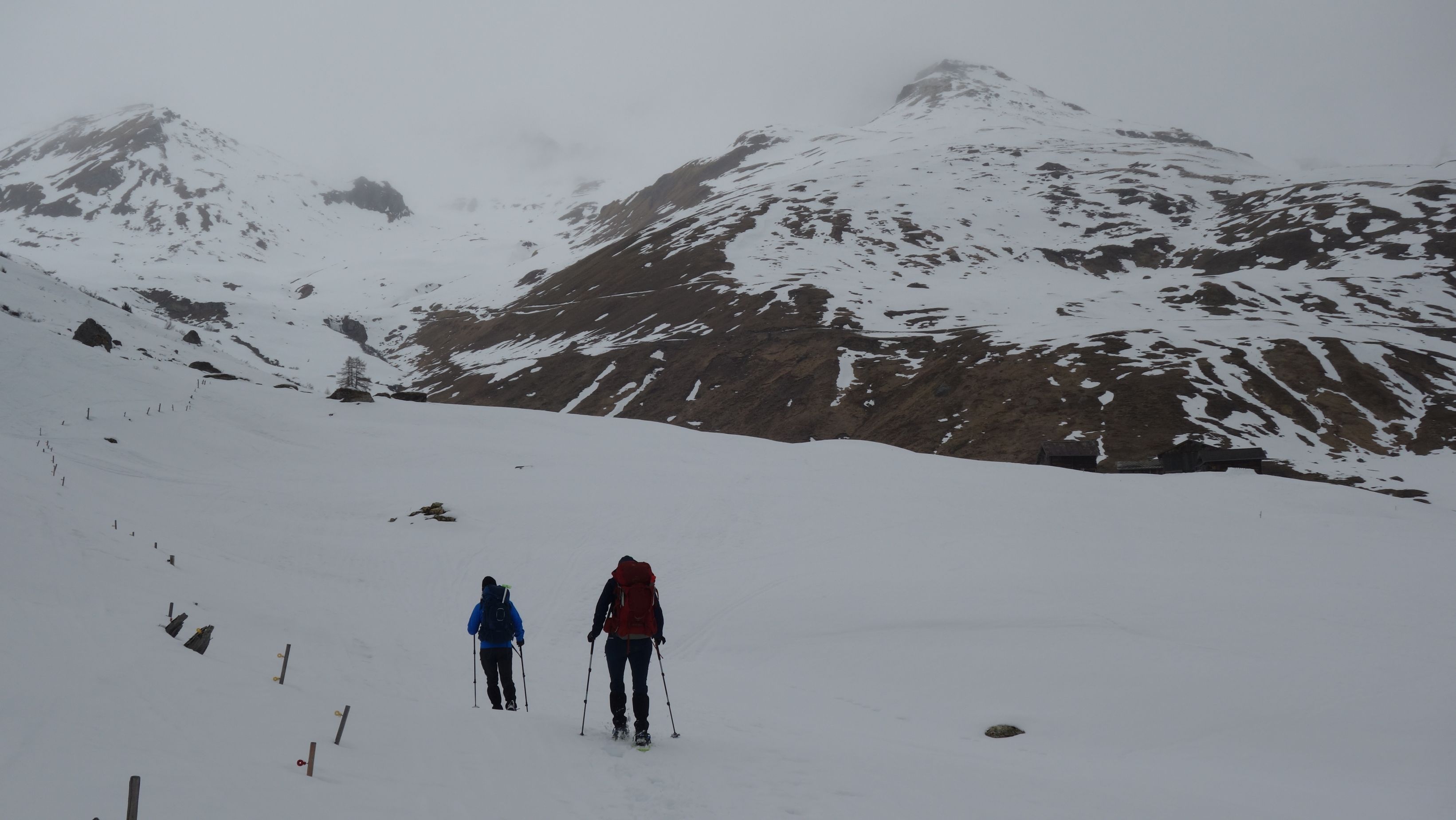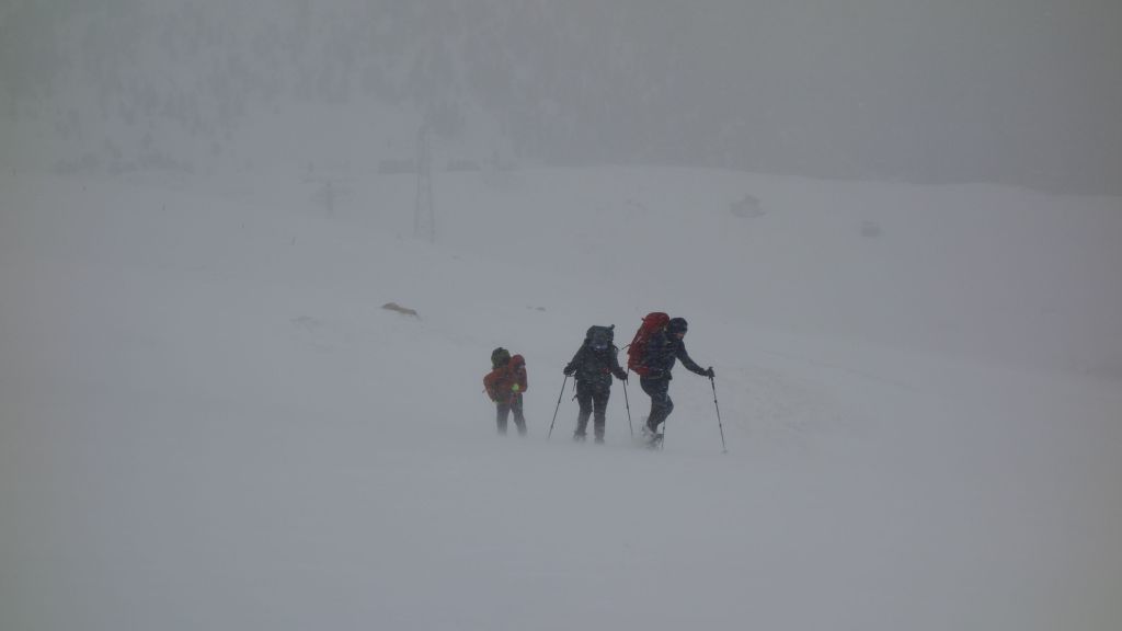 De verse sneeuw zorgt voor een lichte stijging in het lawinegevaar maar theoretisch blijft het mogelijk om de hogere route te nemen naar de Cufercalhütte. Alleen nopen de gure condities met slechte zichtbaarheid en een aanwakkerende wind en sneeuwval ons toch om plan B uit de kast te halen. De route is te lang en uitdagend voor onze groep die fysiek iets minder sterk is. We nemen de postbus naar Sufers om vanuit het dal de berghut te bereiken.