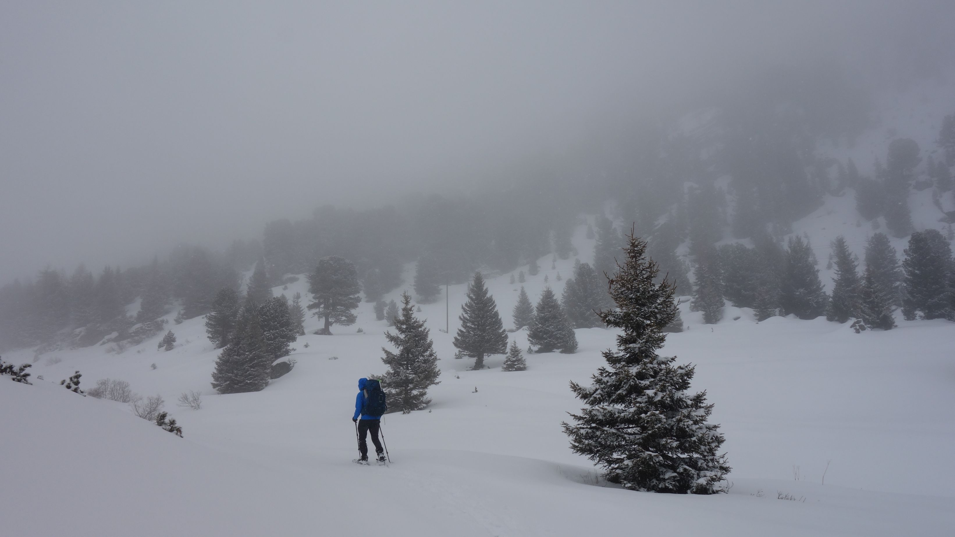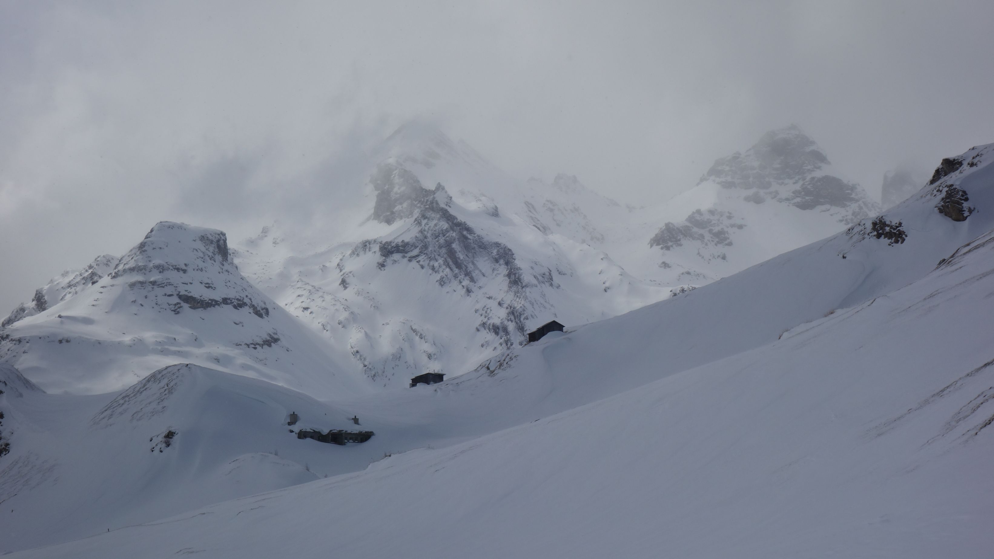 Hoewel het lawinerisico nog altijd erg laag is, spreekt het beeld achter het raam boekdelen. Mist en vliegende sneeuw is het enige dat we zien. Het is te guur weer voor lange tochten.