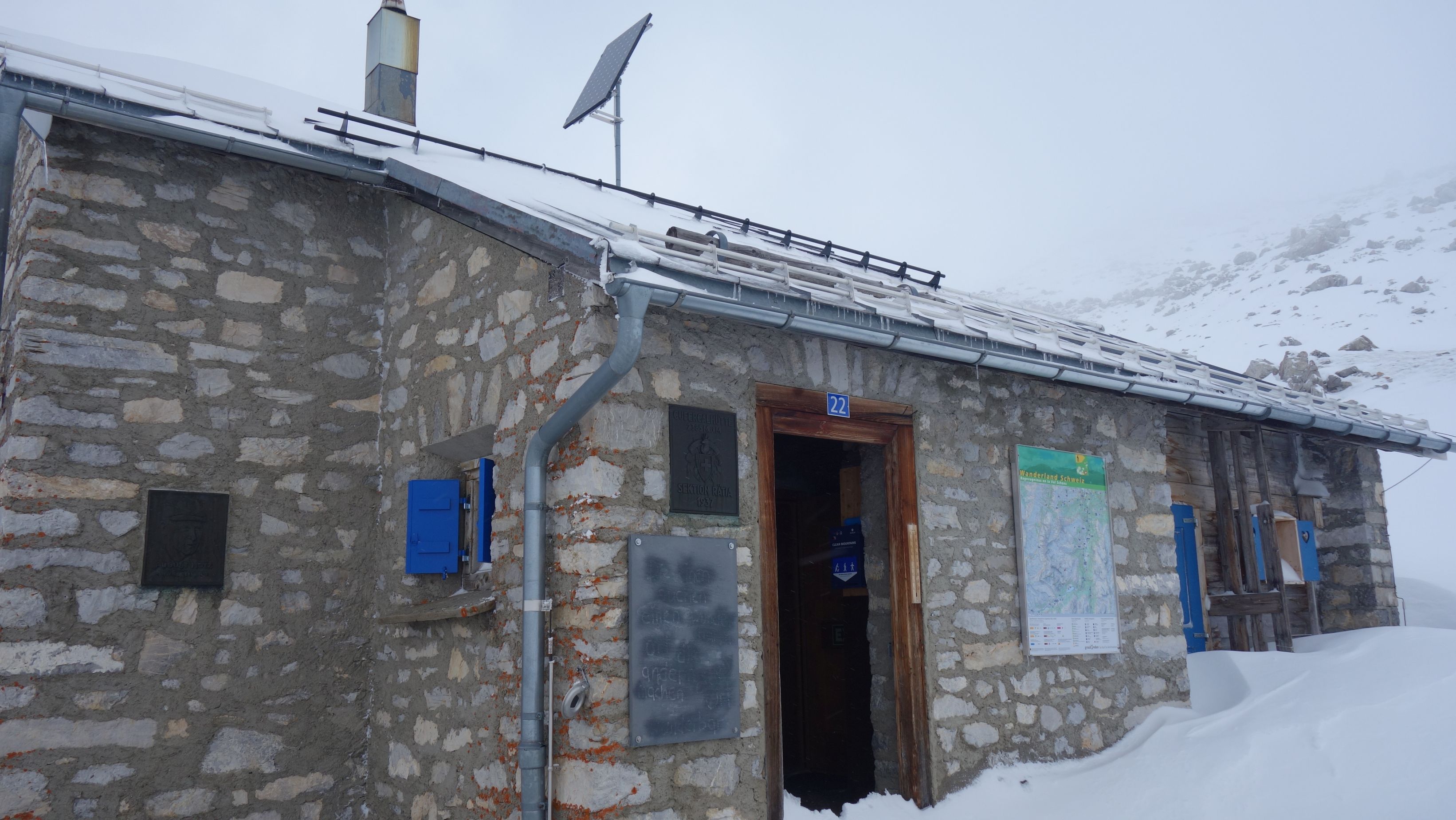 Cufercalhütte zou eerst bemand zijn maar werd overgenomen door een nieuwe uitbater en enkel het winterraum bleek beschikbaar. Reserveren is nodig want pas dan krijg je de code om binnen te kunnen. Er is hout ter beschikking om de kachel op te stoken in de kleine leefruimte. We waren er met 6 (maximumcapaciteit). De bron was bevroren (en onvindbaar) dus moesten we sneeuw smelten. In mooi weer een prachtige plek maar we hebben helaas weinig van de omgeving gezien.