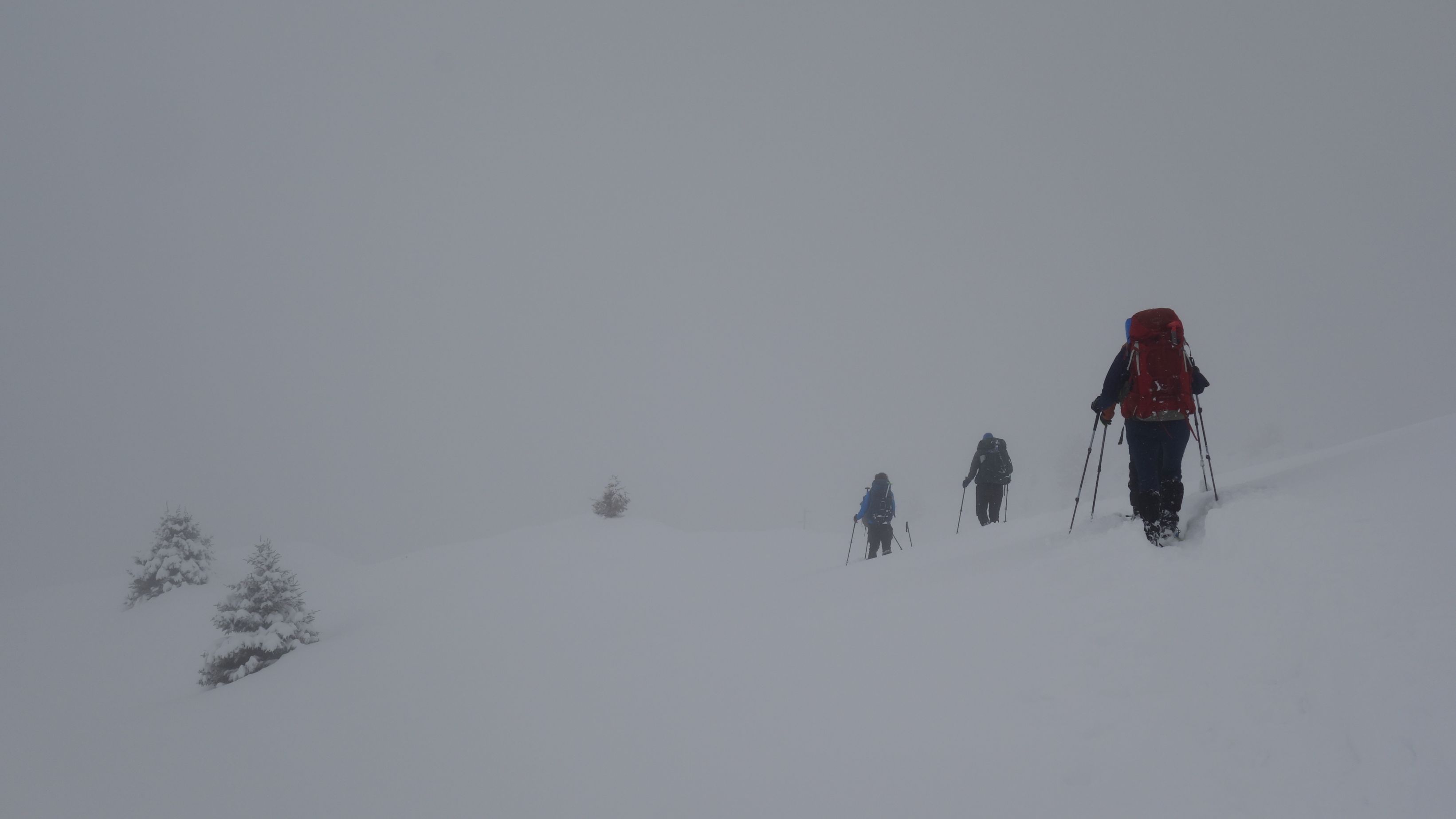 Daarna begint de wind steeds meer aan te wakkeren. Goed ingeduffeld trekken we letterlijk van het ene houten huisje naar het andere waar we elkaar opwachten. Sommigen blijven iets te lang talmen bij een pauze en ik schud ze kordaat wakker. Dit is geen weer om lang stil te blijven staan. We moeten ook dicht genoeg bij elkaar blijven gezien de zichtbaarheid nu fel vermindert. Mijn handheld GPS-toestel is ons baken, veel handiger met knoppen met dikke handschoenen te bedienen dan een smartphone.