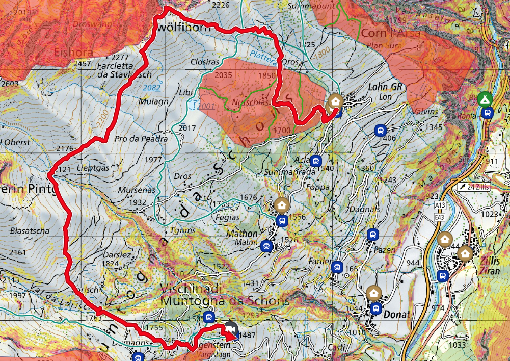 Voor de gelopen tochten zijn volgende stafkaarten van Swisstopo (1:25.000) nodig: 1215 Thusis en 1235 Andeer. Deze zijn erg handig om een overzicht te hebben , te oefenen op het kaartlezen en als back-up als je elektronica de mist in gaat.