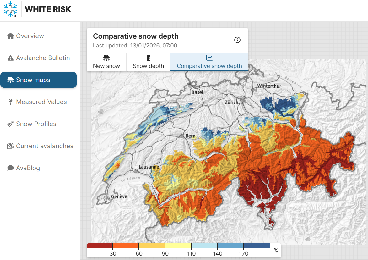In de volgende kaart zie je de situatie op dit moment (10 januari 2026) over de relatieve sneeuwhoogte tegenover het langjarig gemiddelde. Momenteel is die maar 50% in die regio, terwijl het westen wel meer sneeuw krijgt.